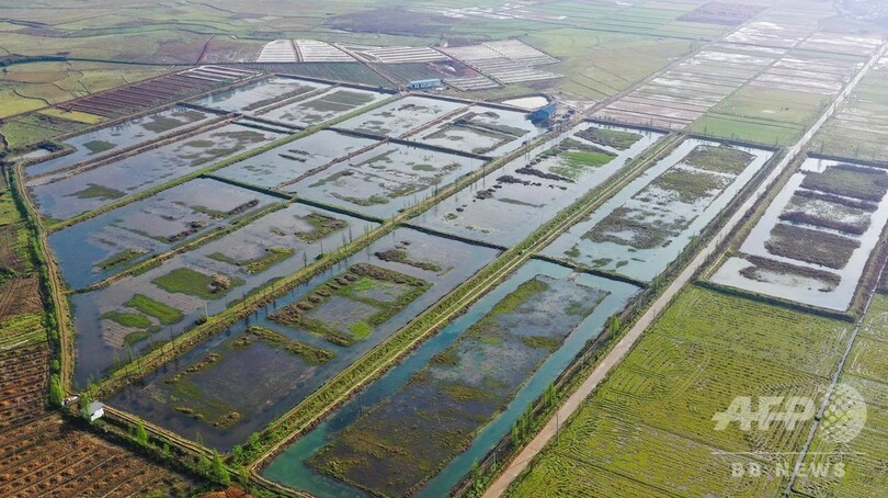 同地では近年、優れた自然環境を利用して「蝦稲共作」を奨励しており、自然に優しい農法や経済的メリット、社会的効果の「一挙三得」の効果を生み出している。(c)CNS/JCM/AFPBB News