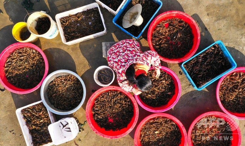 同地では近年、優れた自然環境を利用して「蝦稲共作」を奨励しており、自然に優しい農法や経済的メリット、社会的効果の「一挙三得」の効果を生み出している。(c)CNS/JCM/AFPBB News