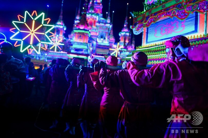 地元の僧侶(50)はAFPに対しサイケデリックな色調や明るくきらめくネオンライトで飾られた複数階の宮殿について、天国を表現していると説明。音楽が流れる中、大声で「私たちの宗教の英雄である僧侶が亡くなり、私たちは皆、彼を失ったことに打ちのめされてる」と述べた。