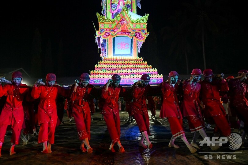 【4月5日 AFP】ミャンマー南部ムドン(Mudon)村で今週、地元で有名な僧侶の追悼式が盛大に営まれ、このために造られた彩りも鮮やかな宮殿に熱心な信者数千人が集まり、追悼の踊りや歌をささげた。