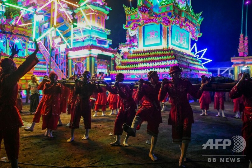 【4月5日 AFP】ミャンマー南部ムドン(Mudon)村で今週、地元で有名な僧侶の追悼式が盛大に営まれ、このために造られた彩りも鮮やかな宮殿に熱心な信者数千人が集まり、追悼の踊りや歌をささげた。