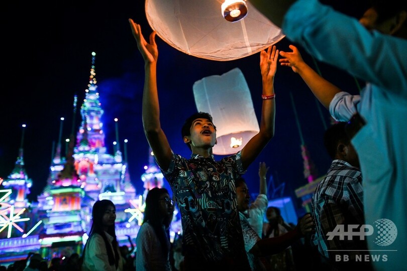 追悼式は先月31日、ひつぎが僧侶の寺院の火葬部屋に運ばれるところで、ひつぎに触れようとする人々が騒ぎ最高潮に達した。火葬からの煙が空に立ち上ると頭上で花火がさく裂し、巡礼者たちは数百個のきらめくランタンを空に放ち、夜遅くまで踊り続けた。(c)AFP