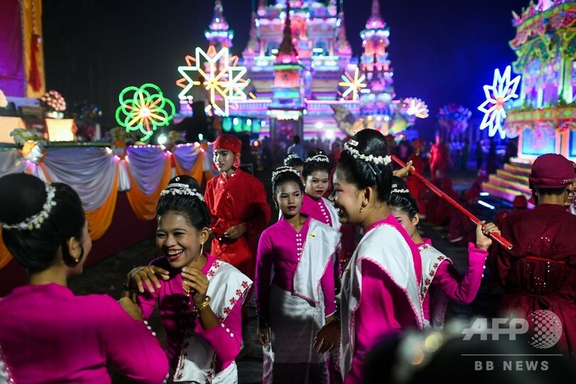 【4月5日 AFP】ミャンマー南部ムドン(Mudon)村で今週、地元で有名な僧侶の追悼式が盛大に営まれ、このために造られた彩りも鮮やかな宮殿に熱心な信者数千人が集まり、追悼の踊りや歌をささげた。
