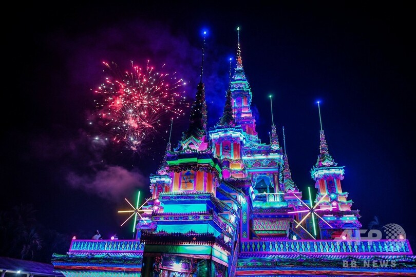 地元の僧侶(50)はAFPに対しサイケデリックな色調や明るくきらめくネオンライトで飾られた複数階の宮殿について、天国を表現していると説明。音楽が流れる中、大声で「私たちの宗教の英雄である僧侶が亡くなり、私たちは皆、彼を失ったことに打ちのめされてる」と述べた。