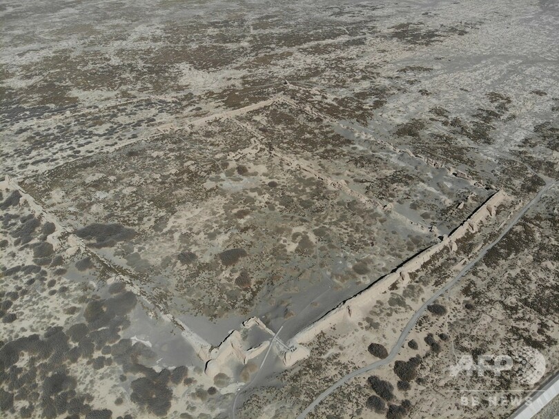 【5月7日 CNS】上空から撮影した、中国・甘粛省(Gansu)の世界遺産「鎖陽城(Suoyangcheng)」。鎖陽城遺跡は同省瓜州県(Guazhou)鎖陽城鎮の東南、ゴビ砂漠の中にある。黄河の西側に位置する険しい山に挟まれた細長い地形の河西回廊(Hexi Corridor)西端に位置し、古代シルクロード上の中原と西域をつなぐ交通の要衝だった。