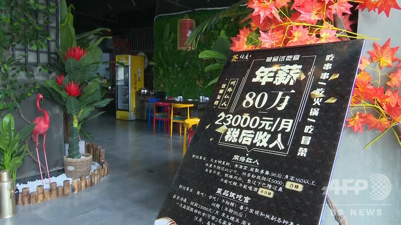「みな高額の報酬に引かれて応募するが、この仕事のハードルは非常に高い」と陳さん。「募集している2つのポストのうち、『ネットセレブ』には実況動画配信で店の宣伝をやってもらう。『料理試食員』には料理の味を確認して店の料理の水準向上に貢献してもらう。報酬の設定が高すぎるのではないかと言う人が多いが、店側の応募者に対する要求も高い。選考ではファンの数を見るし、容姿についても整形はダメ。どの条件も非常に厳しく設定している」(c)CNS/JCM/AFPBB News