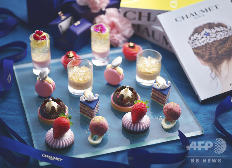 伝統的なスタイルを継承しながら最先端のデザインを追求する「ショーメ」の世界観からインスパイアされた「プリンセス・セレブレーション」は、「ショーメ」のアイコニックなティアラなどのデザインをスイーツとセイボリーで表現。ティアラデザインのタルトや光を受けてキラキラと輝きを放つジュレなど、華やかで繊細な5種類のスイーツと、銀箔でアクセントを加えたフォアグラムースなど3種類のセイボリーが並ぶ。
