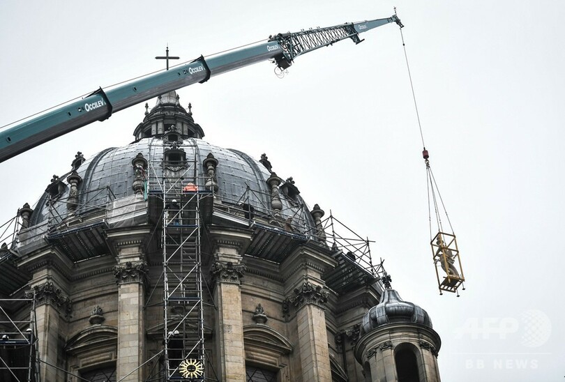 一方、パリ中心部にあるノートルダム・ドゥ・バルドグラス(Notre-Dame du Val-de-Grace)教会では10日、修復作業を終えた天使や精霊の彫像を、クレーンを使ってドーム(丸屋根)の上に戻す作業が行われた。(c)AFP