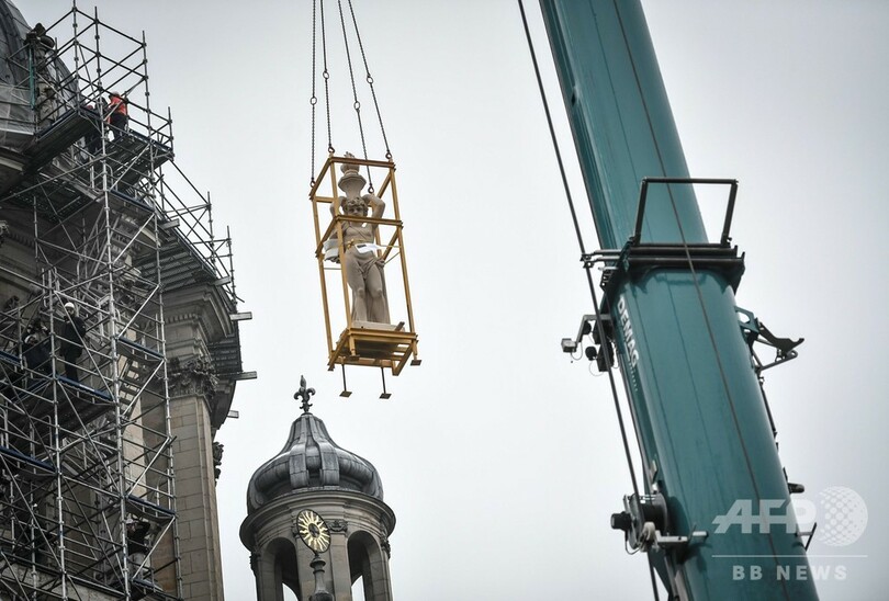 一方、パリ中心部にあるノートルダム・ドゥ・バルドグラス(Notre-Dame du Val-de-Grace)教会では10日、修復作業を終えた天使や精霊の彫像を、クレーンを使ってドーム(丸屋根)の上に戻す作業が行われた。(c)AFP