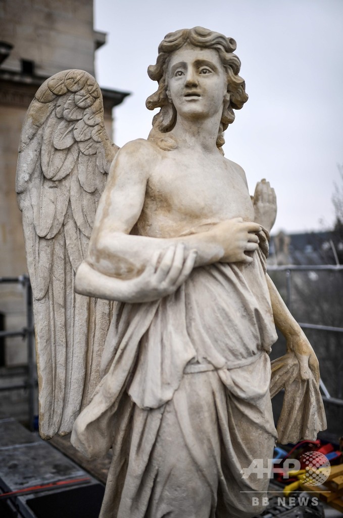 一方、パリ中心部にあるノートルダム・ドゥ・バルドグラス(Notre-Dame du Val-de-Grace)教会では10日、修復作業を終えた天使や精霊の彫像を、クレーンを使ってドーム(丸屋根)の上に戻す作業が行われた。(c)AFP