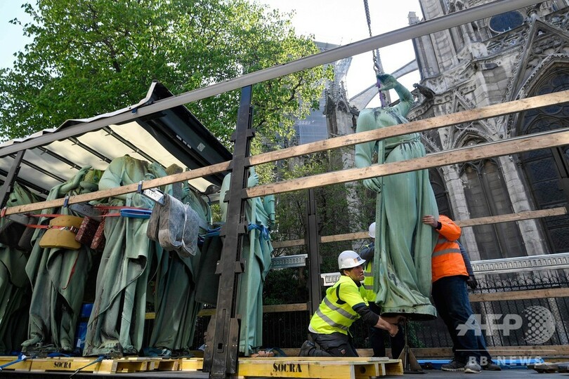 【4月12日 AFP】フランス・パリにあるノートルダム大聖堂(Notre Dame Cathedral)で、修復作業が行われている。11日には、十二使徒と伝道師の彫像計16体が、高さ50メートルの位置にある尖塔から修復作業のためクレーンを使って地上に下ろされた。