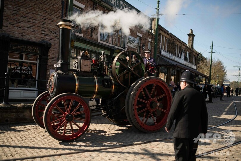 【4月12日 AFP】英イングランド北部チェスタールストリート(Chester-le-Street)近郊にある屋外歴史博物館「ビーミッシュ(Beamish)」で11日、1930年代以前の乗り物を集めたイベント「グレートノース・ストリームフェア(Great North Steam Fair)」が始まり、機関車やけん引車、ローラー、消防車、バイクなど、蒸気式とモーター式の乗り物140台以上が登場した。当時の服装をした従業員らが雰囲気を盛り上げていた。(c)AFP