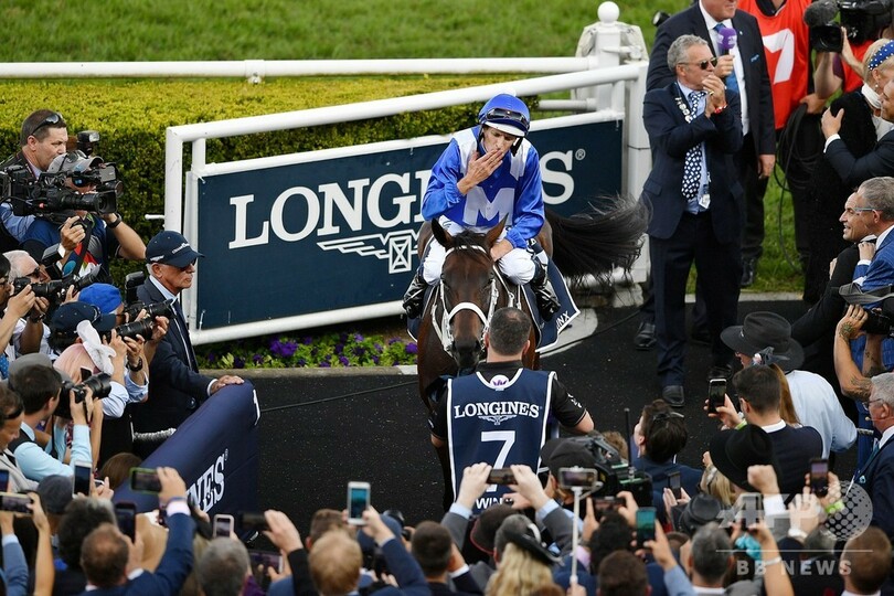 5万人の観客が見守る中、圧倒的1番人気のウィンクスはいつものように最後の直線で抜け出し、歴代最多を誇るG1勝利数を25に更新し、輝かしいキャリアに幕を下ろした。(c)AFP