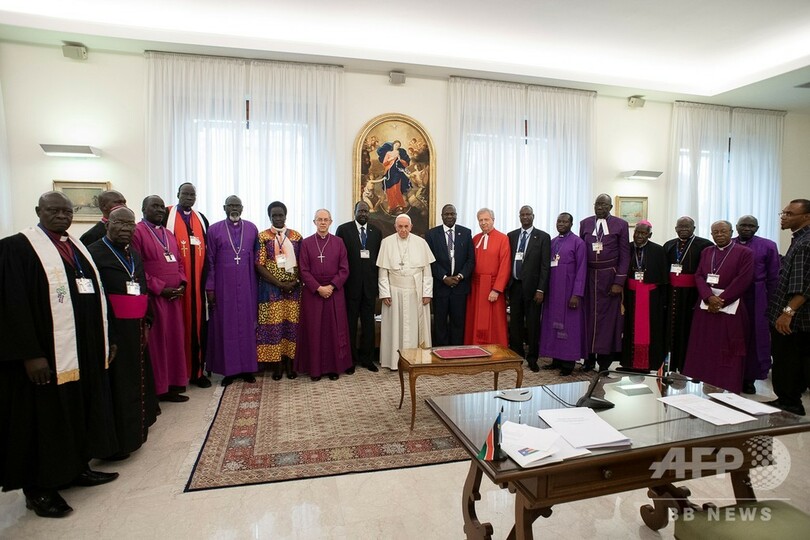 【4月13日 AFP】ローマ・カトリック教会のフランシスコ法王(Pope Francis)は11日、ローマ法王庁(バチカン)を訪れていた南スーダンのサルバ・キール(Salva Kiir)大統領と、反政府勢力を率いるリヤク・マシャール(Riek Machar)氏と会見し、ひざまずいて両者の足にキスをした。