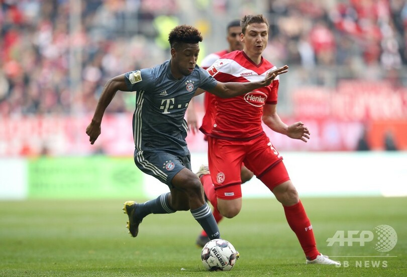 【4月15日 AFP】18-19ドイツ・ブンデスリーガ1部は14日、第29節の試合が行われ、バイエルン・ミュンヘン(Bayern Munich)はチームメートとのトラブルを起こしたキングスレイ・コマン(Kingsley Coman)が再出発の2得点を決め、フォルトゥナ・デュッセルドルフ(Fortuna Dusseldorf 1895)から4-1の快勝を収めてリーグ首位を守った。