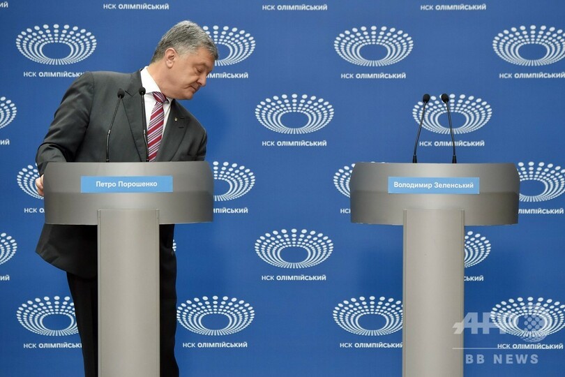 2014年の民衆蜂起を受けて権力の座に就いたポロシェンコ氏は、政界入りして間もないゼレンスキー氏との論戦を望んでいた。ポロシェンコ氏は、会場に現れなかったゼレンスキー氏を厳しい質問から逃げたと非難した。