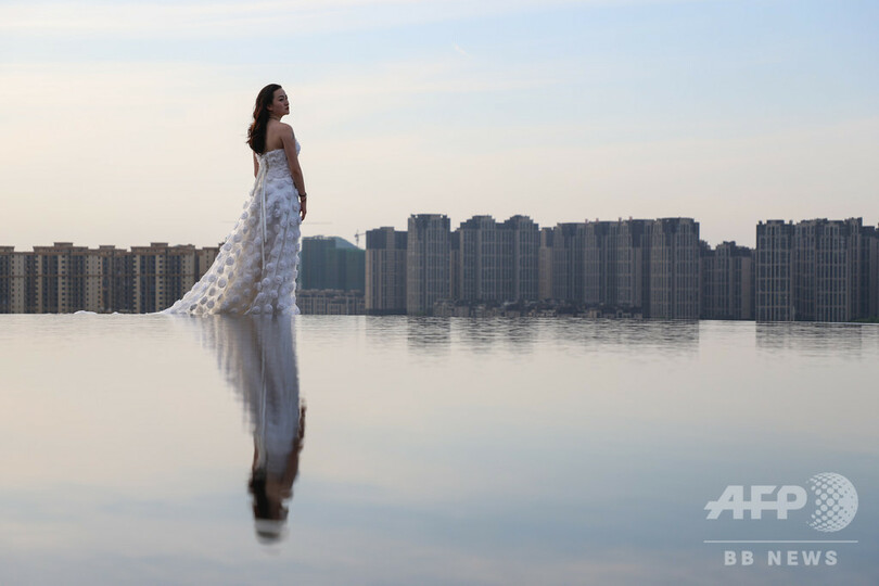 「天空の鏡」は、公園内の山の山頂にある直径約8メートルの円形の池。巨大な鏡のような水面に、空や雲やビルなどの景色が逆さまに映し出されている。(c)CNS/JCM/AFPBB News