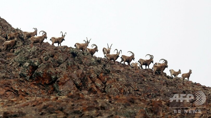 春に入り、国家一級野生保護動物に指定されているシベリアンアイベックスの群れが数多く現れている。かつてはほとんど目にすることのなかったオスの群れが多い。(c)CNS/JCM/AFPBB News
