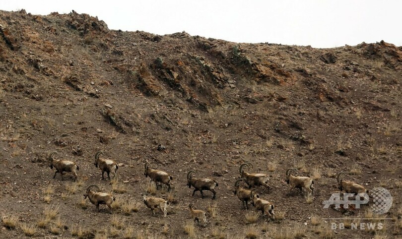 春に入り、国家一級野生保護動物に指定されているシベリアンアイベックスの群れが数多く現れている。かつてはほとんど目にすることのなかったオスの群れが多い。(c)CNS/JCM/AFPBB News
