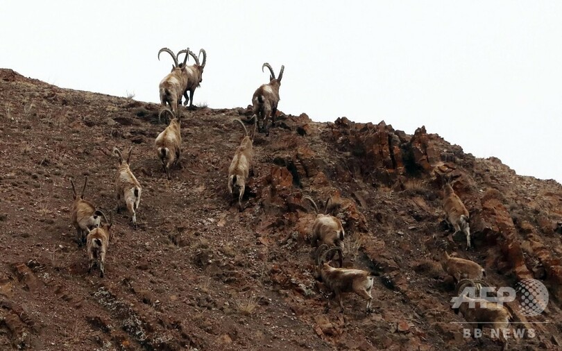 春に入り、国家一級野生保護動物に指定されているシベリアンアイベックスの群れが数多く現れている。かつてはほとんど目にすることのなかったオスの群れが多い。(c)CNS/JCM/AFPBB News