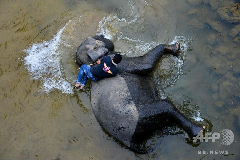 【4月18日 AFP】インドネシア・アチェ(Aceh)州南部のルスル自然地域(Leuser Ecosystem)で15日、スマトラゾウに水浴びをさせるゾウ使いの姿が見られた。(c)AFP
