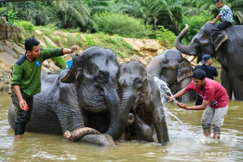 【4月18日 AFP】インドネシア・アチェ(Aceh)州南部のルスル自然地域(Leuser Ecosystem)で15日、スマトラゾウに水浴びをさせるゾウ使いの姿が見られた。(c)AFP