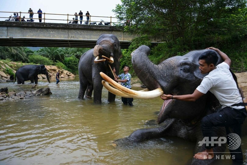 【4月18日 AFP】インドネシア・アチェ(Aceh)州南部のルスル自然地域(Leuser Ecosystem)で15日、スマトラゾウに水浴びをさせるゾウ使いの姿が見られた。(c)AFP