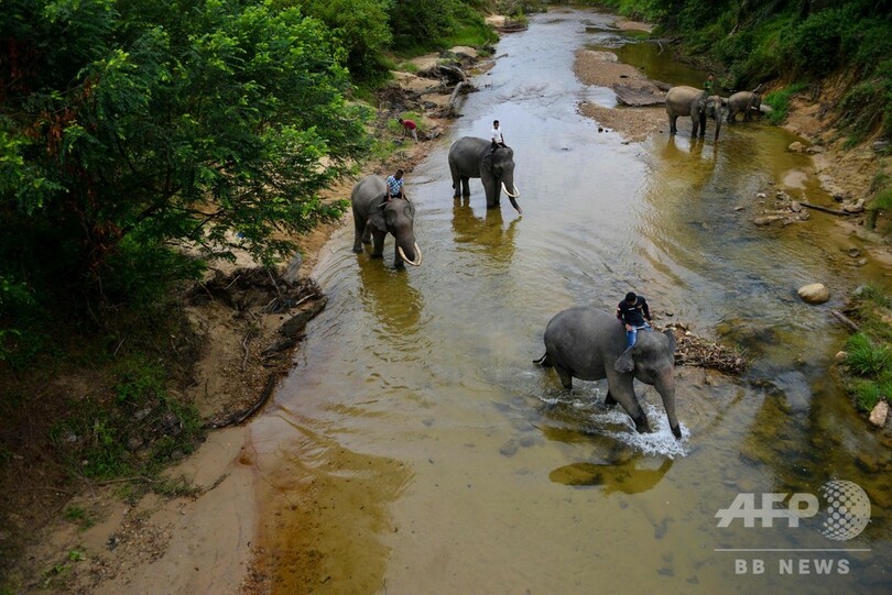 【4月18日 AFP】インドネシア・アチェ(Aceh)州南部のルスル自然地域(Leuser Ecosystem)で15日、スマトラゾウに水浴びをさせるゾウ使いの姿が見られた。(c)AFP