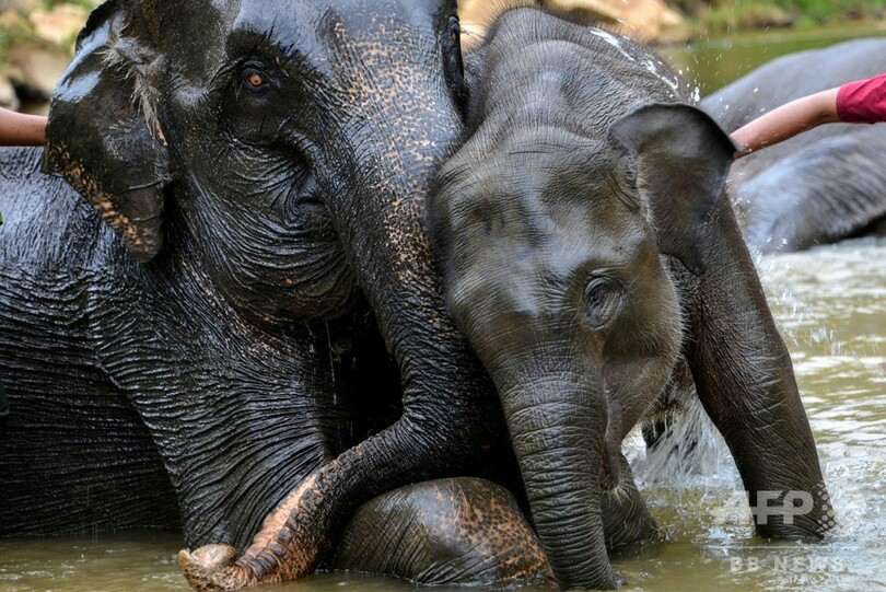 【4月18日 AFP】インドネシア・アチェ(Aceh)州南部のルスル自然地域(Leuser Ecosystem)で15日、スマトラゾウに水浴びをさせるゾウ使いの姿が見られた。(c)AFP