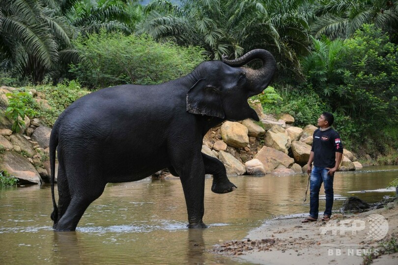【4月18日 AFP】インドネシア・アチェ(Aceh)州南部のルスル自然地域(Leuser Ecosystem)で15日、スマトラゾウに水浴びをさせるゾウ使いの姿が見られた。(c)AFP
