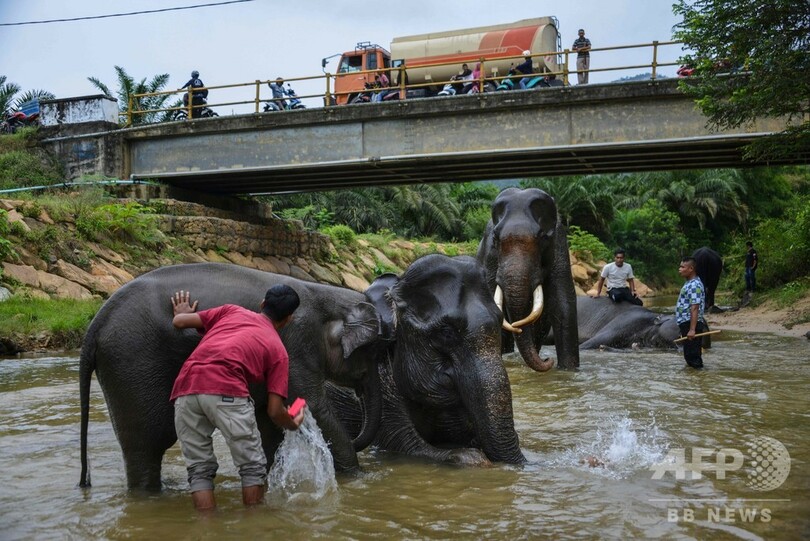 【4月18日 AFP】インドネシア・アチェ(Aceh)州南部のルスル自然地域(Leuser Ecosystem)で15日、スマトラゾウに水浴びをさせるゾウ使いの姿が見られた。(c)AFP