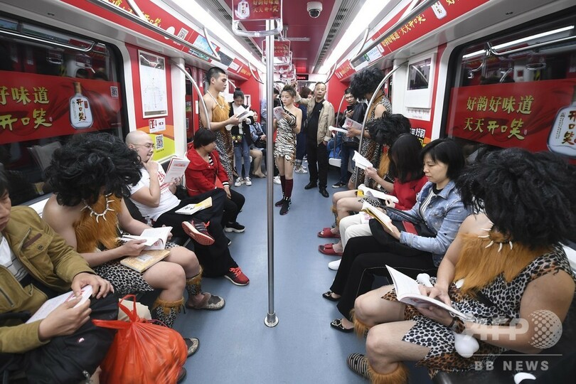「原始人」のコスプレで「スマホ離れて本に戻ろう」 長沙の地下鉄でフラッシュモブ