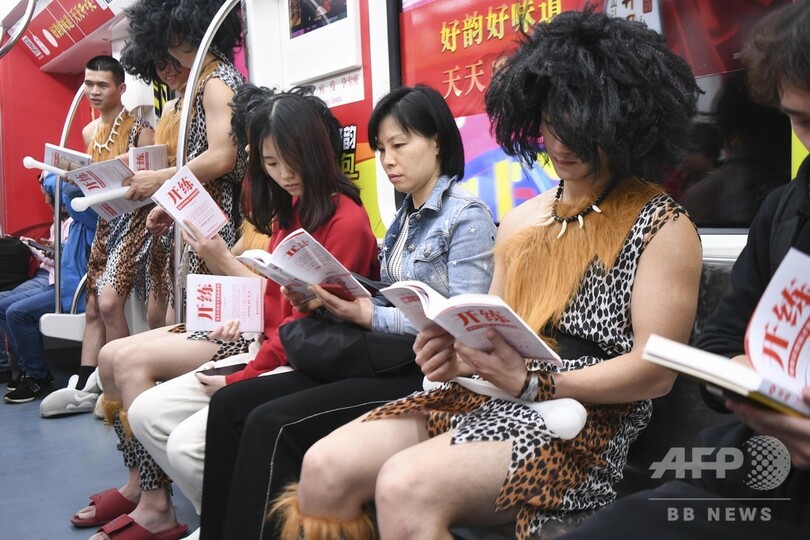 「原始人」のコスプレで「スマホ離れて本に戻ろう」 長沙の地下鉄でフラッシュモブ