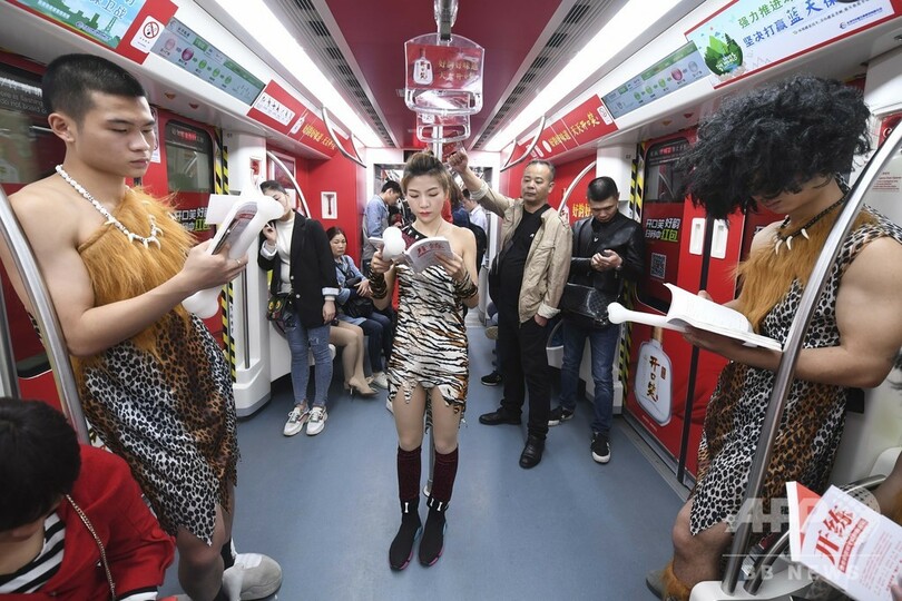 「原始人」のコスプレで「スマホ離れて本に戻ろう」 長沙の地下鉄でフラッシュモブ