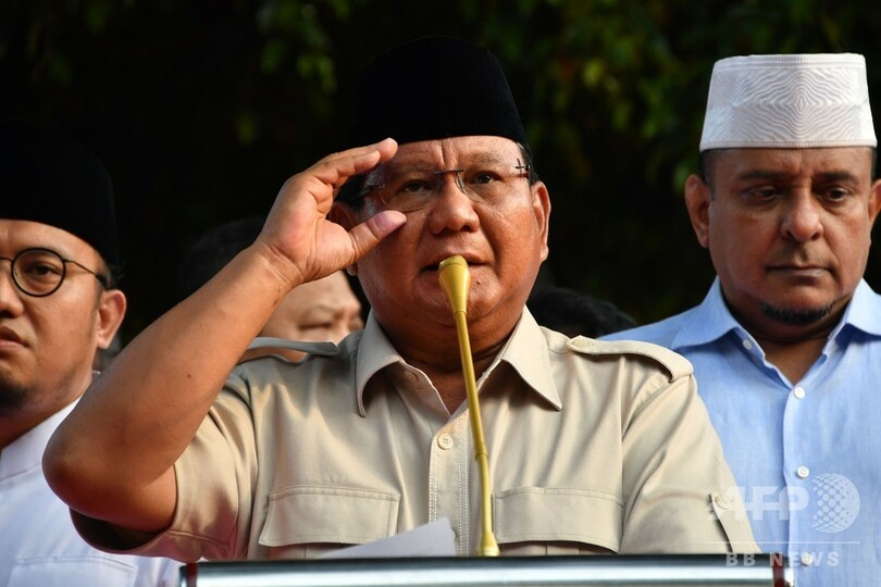 プラボウォ氏は、自身がインドネシアの次期指導者だと主張したものの、具体的な根拠は示さなかった。同氏はこれに先立ち、自身が敗北すれば街頭デモや法的措置に打って出ると警告していた。(c)AFP/Kiki Siregar