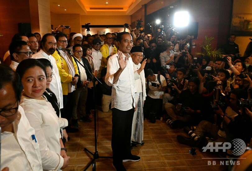 ジョコ大統領は首都ジャカルタで歓声を上げる支持者らを前に「われわれは皆、出口調査と即時集計の数字を目にしたが、それでも公式結果を待つ必要がある」と語った。