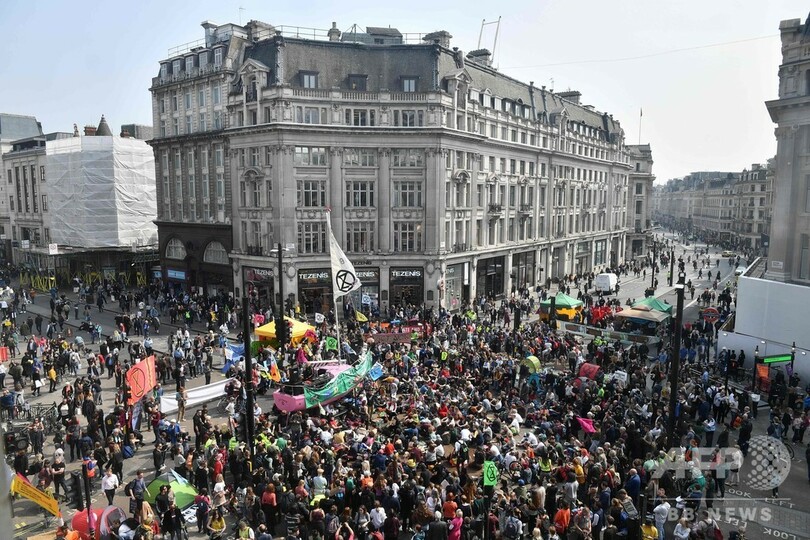 【4月19日 AFP】英首都ロンドンでは、気候変動の危険性を訴える活動家らによる大規模なデモにより市内の一部で交通がまひするなどしており、デモが始まった15日以降、400人以上が逮捕された。