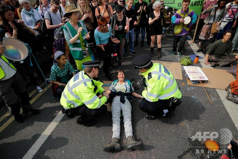 【4月19日 AFP】英首都ロンドンでは、気候変動の危険性を訴える活動家らによる大規模なデモにより市内の一部で交通がまひするなどしており、デモが始まった15日以降、400人以上が逮捕された。