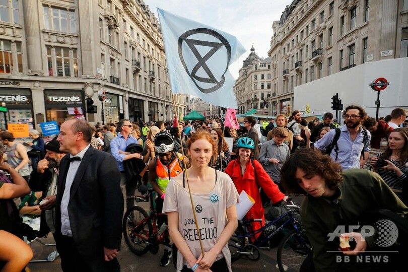 一連のデモは学者らが昨年設立した運動団体「絶滅への反逆(Extinction Rebellion)」が主導している。絶滅への反逆は環境保護運動において最も急成長している団体の一つとなっている。(c)AFP