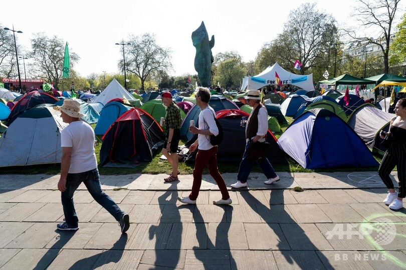 【4月21日 AFP】英ロンドンで20日、気候変動の危険性を訴える抗議運動「絶滅への反逆(Extinction Rebellion)」の6日目の大規模デモが行われた。デモが始まった15日以降、逮捕者は718人に上っている。