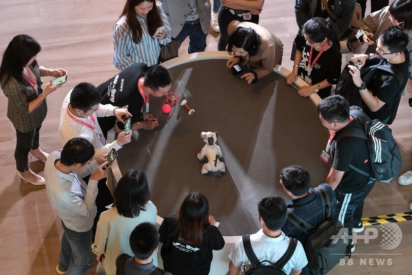 今回の展示会では、エレクトロニクスや映像、映画・テレビ、音楽、ゲーム、漫画・アニメ、教育などの分野を含む技術応用の発展の現状を展示。最先端AI技術を搭載した犬型ロボットの「アイボ(aibo)」や、全方位から臨場感のある音を体験できる音響技術「360度リアリティオーディオ(360 Reality Audio)」が中国で初めて展示された。(c)CNS/JCM/AFPBB News