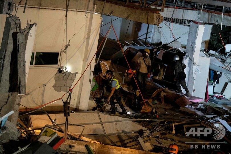 【4月23日 AFP】(写真追加)フィリピン北部で22日に発生した強い地震で、死者が11人に上ったことが分かった。23日現在も、ビルの倒壊で生き埋めになったとみられる数十人の救出活動が続いている。