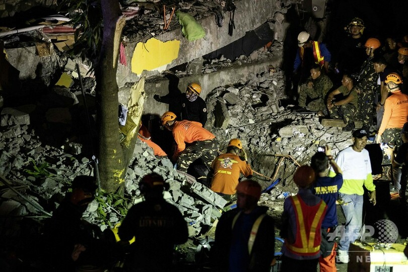 【4月23日 AFP】(写真追加)フィリピン北部で22日に発生した強い地震で、死者が11人に上ったことが分かった。23日現在も、ビルの倒壊で生き埋めになったとみられる数十人の救出活動が続いている。