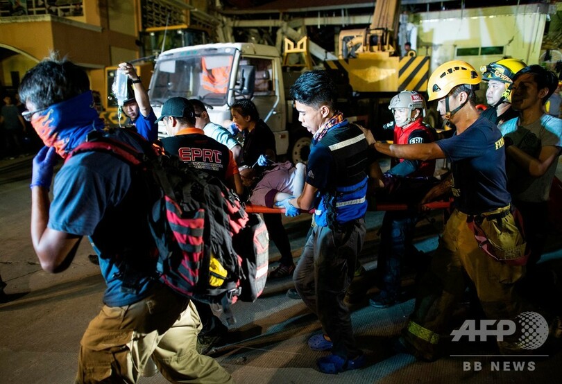 【4月23日 AFP】(写真追加)フィリピン北部で22日に発生した強い地震で、死者が11人に上ったことが分かった。23日現在も、ビルの倒壊で生き埋めになったとみられる数十人の救出活動が続いている。