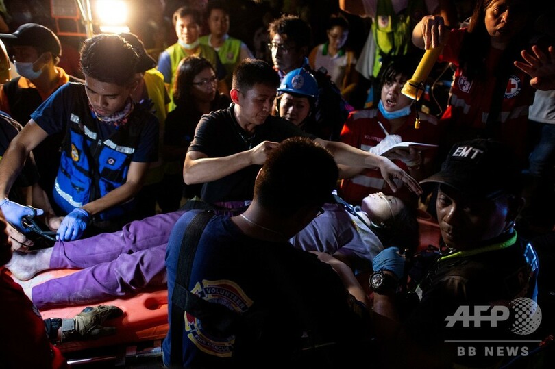 【4月23日 AFP】(写真追加)フィリピン北部で22日に発生した強い地震で、死者が11人に上ったことが分かった。23日現在も、ビルの倒壊で生き埋めになったとみられる数十人の救出活動が続いている。