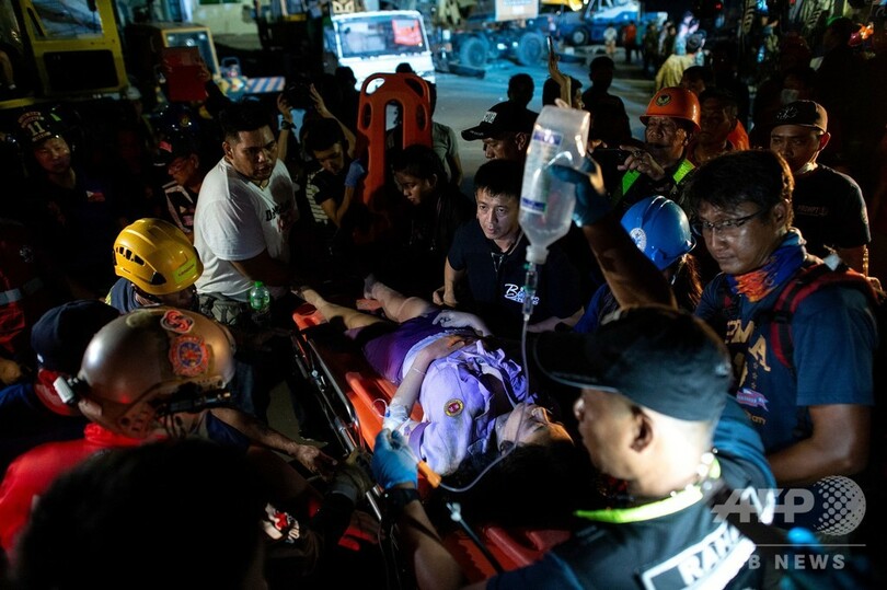 【4月23日 AFP】(写真追加)フィリピン北部で22日に発生した強い地震で、死者が11人に上ったことが分かった。23日現在も、ビルの倒壊で生き埋めになったとみられる数十人の救出活動が続いている。
