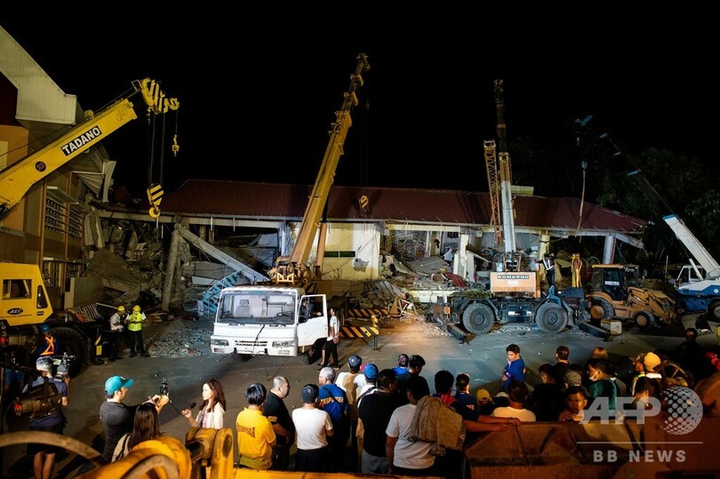 【4月23日 AFP】(写真追加)フィリピン北部で22日に発生した強い地震で、死者が11人に上ったことが分かった。23日現在も、ビルの倒壊で生き埋めになったとみられる数十人の救出活動が続いている。