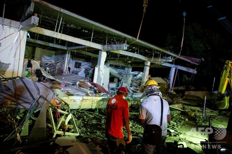 【4月23日 AFP】(写真追加)フィリピン北部で22日に発生した強い地震で、死者が11人に上ったことが分かった。23日現在も、ビルの倒壊で生き埋めになったとみられる数十人の救出活動が続いている。