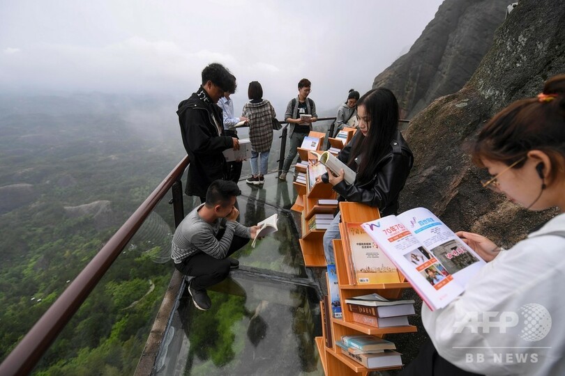 【4月25日 CNS】世界図書・著作権デー(4月23日、World Book and Copyright Day)に合わせ、より多くの人たちに本を読んでもらおうと、中国・湖南省(Hunan)岳陽市(Yueyang)平江県(Pingjiang)の石牛寨(Shiniuzhai)風景区で、断崖絶壁のガラス桟道に書棚が設置された。本の閲覧は無料で、観光客らが手に取って読んでいた。(c)CNS/JCM/AFPBB News