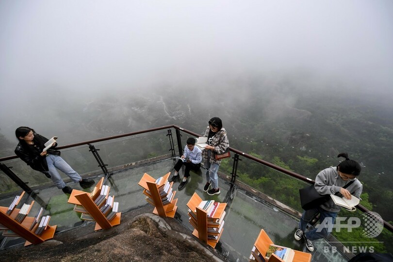 【4月25日 CNS】世界図書・著作権デー(4月23日、World Book and Copyright Day)に合わせ、より多くの人たちに本を読んでもらおうと、中国・湖南省(Hunan)岳陽市(Yueyang)平江県(Pingjiang)の石牛寨(Shiniuzhai)風景区で、断崖絶壁のガラス桟道に書棚が設置された。本の閲覧は無料で、観光客らが手に取って読んでいた。(c)CNS/JCM/AFPBB News